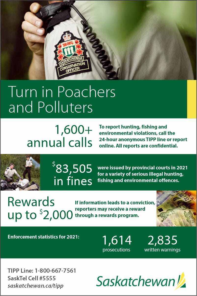 Help conservation officers protect Saskatchewan's natural resources and environment by calling the toll-free Turn In Poachers and Polluters (TIPP) line to report suspected wildlife, fisheries, forestry or environmental violations.