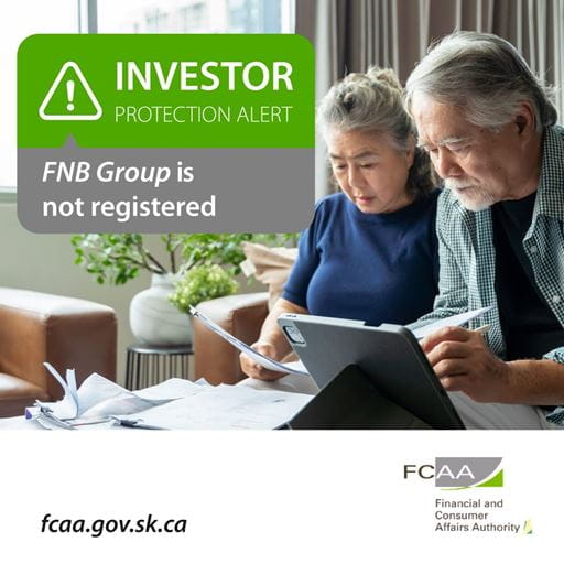 If you have invested with FNB Group Ltd, FNB Group Trading, "Ben Williams" or anyone claiming to be acting on their behalf, contact the FCAA's Securities Division at 306-787-5936.
