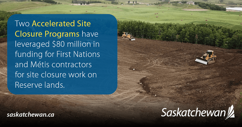 Saskatchewan's Accelerated Site Closure Program (ASCP) has led to strong participation in two provincial programs, the First Nations Stewardship Fund (Stewardship Fund) and the Indigenous Business Credit Pool (Credit Pool). Announced in January 2021, these programs have leveraged $80 million in ASCP funding for First Nations and Métis contractors and for site closure work on Reserve lands across Saskatchewan.