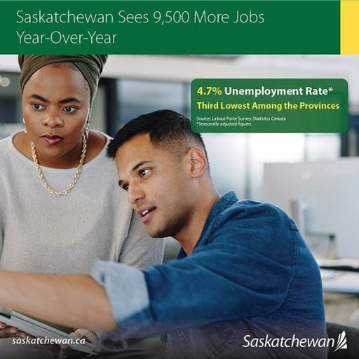 Saskatchewan’s seasonally adjusted unemployment rate reached 4.7 per cent, down from 5.0 per cent one year ago and is below the national average of 5.0 per cent.