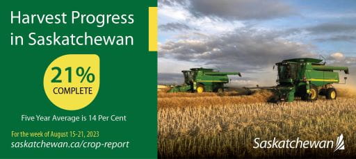 Producers continued to make progress harvesting their crops this week. Scattered rain helped with moisture levels as systems moved through the province. Saskatchewan is now 21 per cent completed harvest, ahead of the five-year average of 14 per cent and the 10-year average of 11 per cent.