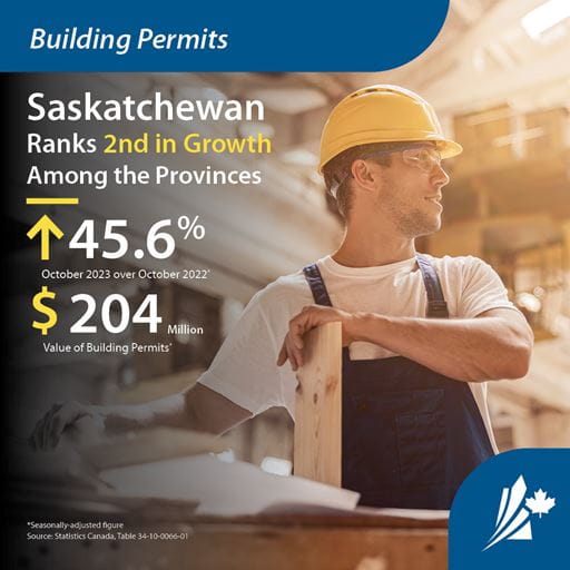 Today, Statistics Canada released October 2023 numbers on the value of building permits, with Saskatchewan jumping 45.6 per cent compared to October 2022 (seasonally adjusted). Saskatchewan ranked second among provinces.