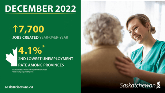 Today, Statistics Canada released December 2022 job numbers, showing Saskatchewan's continued economic growth having added 7,700 jobs when compared to December 2021, with month-to-month employment also increasing by 4,200.