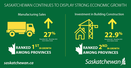 Statistics Canada has released the November 2022 manufacturing sales and investment in building construction data, showing Saskatchewan's economy remains strong.