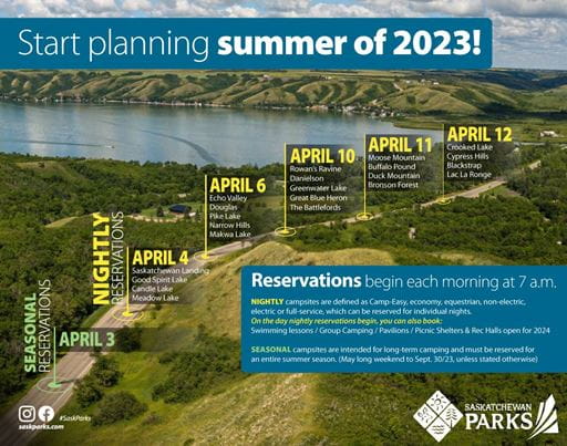 Reservations for Saskatchewan Provincial Parks 2023 camping season are set to begin April 3 for seasonal campsites and April 4 to 12 for nightly, Camp-Easy and group campsites.