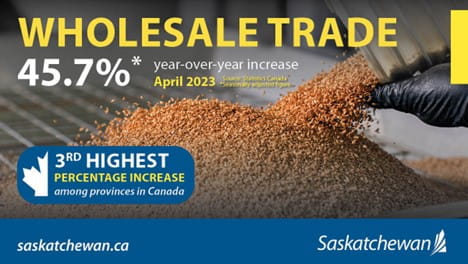 Today, Statistics Canada released April 2023 wholesale trade figures, showing Saskatchewan with an increase of 45.7 per cent compared to the same time last year (seasonally adjusted). This was the third highest percentage change among the provinces.