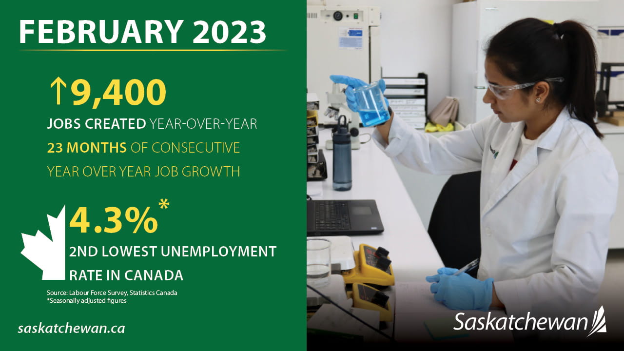 Today, Statistics Canada released February labour force figures that indicate Saskatchewan's continued growth, with 9,400 new jobs when compared to February 2022, an increase of 1.6 per cent.