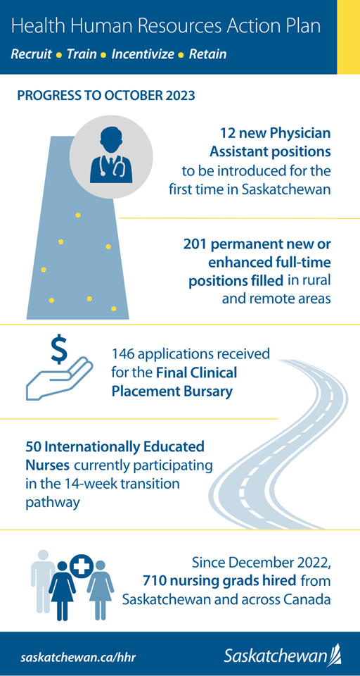 Details on health care opportunities, how to access them and more information on the province's HHR Action Plan are available at saskatchewan.ca/HHR.