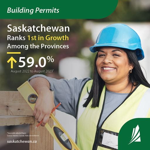 Today, Statistics Canada released August 2023 numbers on the value of building permits, with Saskatchewan jumping 59.0 per cent compared to August 2022 (seasonally adjusted). Saskatchewan ranked highest among provinces, while nationally, permits were down by 5.9 per cent.