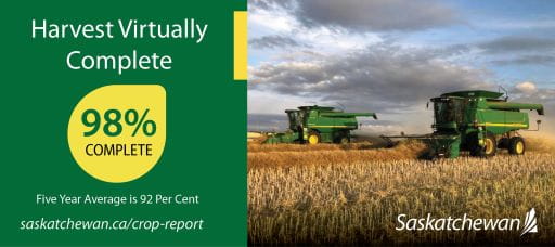 Harvest is virtually complete in Saskatchewan with 98 per cent of the crop in the bin. Producers were resilient this growing season. The warm, dry conditions led to an early harvest for many and there were some concerns related to water quality and feed access for livestock.