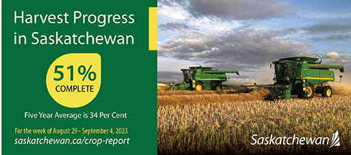 Producers have crossed the half-way point of harvest this week at 51 per cent complete. This is up from 33 per cent last week, ahead of the five-year average (2018-2022) of 34 per cent and the 10-year (2013-2022) of 33 per cent.