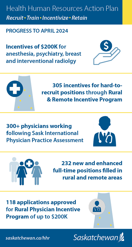 "Continued investment into our ambitious HHR Action Plan ensures Saskatchewan remains an attractive place for health care professionals to live and work," Health Minister Everett Hindley said. "I am pleased to see steady progress being made on multiple initiatives to recruit, train, incentivize and retain more health professionals, strengthen health care teams and deliver improved patient care to residents in communities across the province."