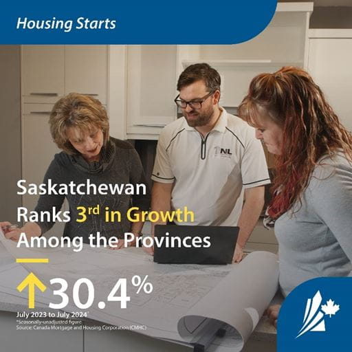 According to the latest data from Statistics Canada, Saskatchewan ranks third among the provinces for housing starts in July 2024 compared to July 2023. These figures highlight the province's thriving economic landscape and its commitment to fostering growth and development that works for everyone.