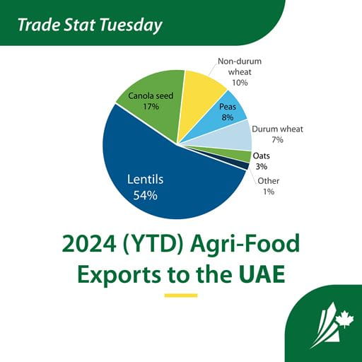 Saskatchewan exported $174 million in lentils to UAE, achieving a 31 per cent increase over the same period last year. Lentils are by far the province's top agri-food export to the UAE this year, responsible for 54 per cent of our exports to that market.