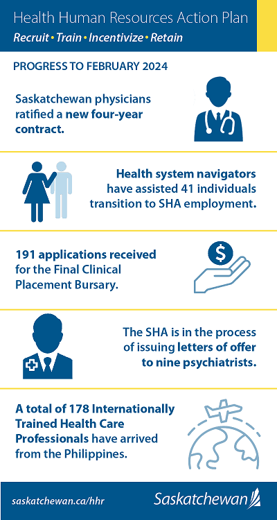 Additional progress is being made on multiple initiatives of Saskatchewan's HHR Action Plan to recruit, train, incentivize and retain more health care workers.
