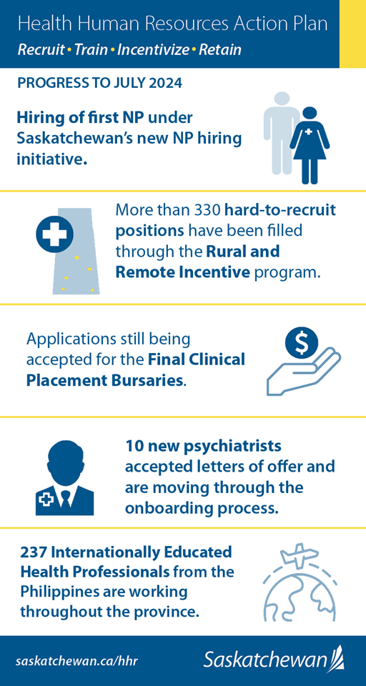 Details on health care opportunities, how to access them and more information on the province's HHR Action Plan are available at saskatchewan.ca/HHR.
