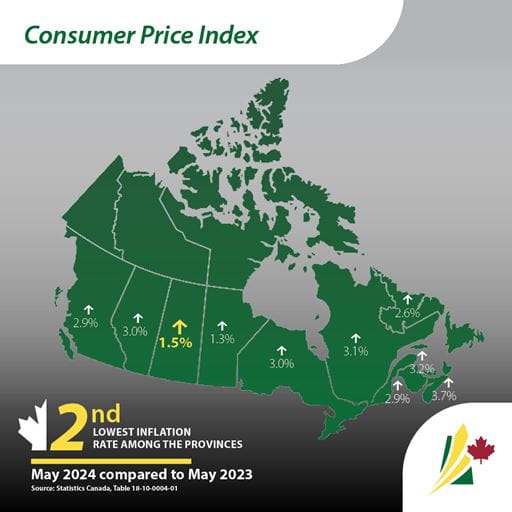 In May 2024, Saskatchewan's Consumer Price Index (CPI) increased by 1.5 per cent compared to May 2023. This is the second lowest rise among the provinces and significantly lower than the national average of 2.9 per cent.