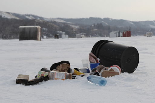 Every year, ice fishing shelters are abandoned on Saskatchewan lakes with predictable results. The structures can break up and wash up on shore along with litter that's often left behind, creating environmental hazards and an ugly mess. Submerged debris is dangerous to boaters, water skiers and others who want to enjoy our lakes in the summer. There can be other costs too, negligent owners can face hefty fines, and the structures and contents can be confiscated.