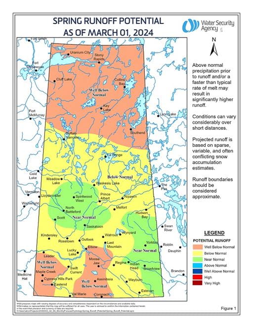 Today, the Water Security Agency (WSA) issued the Spring Runoff Forecast for 2024. A near normal runoff is expected in the Saskatoon area and west toward Biggar, as well as in the eastern portions of the grain belt along the Manitoba border. The remainder of the province is expected to experience below to well below normal runoff this spring.