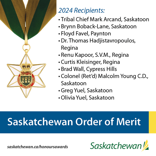 "I am grateful to the newest recipients of the Saskatchewan Order of Merit for making profoundly positive impacts in our communities,” Mirasty said. “By generously giving of their time, talents and resources, they have significantly contributed to the betterment of our province."