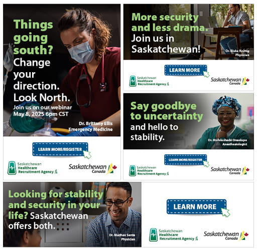 The campaign highlights current career opportunities, upcoming physician-focused information webinars, and will promote the many benefits such as competitive compensation, lower cost of living, work/life balance and stability offered in Saskatchewan. Acknowledging the uncertain political climate in the United States, the advertisements note the stability and security doctors, and their families can experience here.