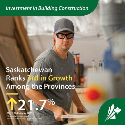 Today, Statistics Canada released figures indicating that Saskatchewan's building construction investment increased by 5.4 per cent in month-over-month growth from April 2025 to May 2025, ranking second among the provinces. The province saw a 21.7 per cent increase in year-over-year growth from May 2025 compared to May 2024, ranking third among the provinces.