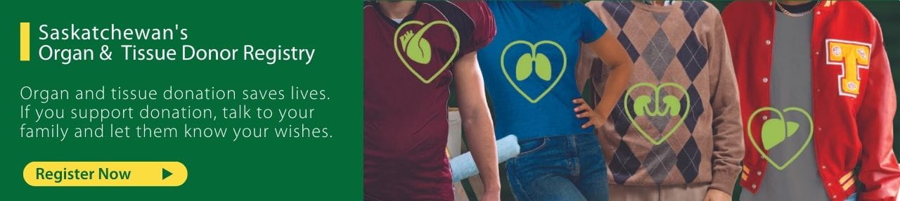 Becoming a registered organ and/or tissue donor can save up to eight lives. Anyone 16 years or older with a valid Saskatchewan health card is eligible to register their intent to become a organ and/or tissue donor after death. Register to be a Donor