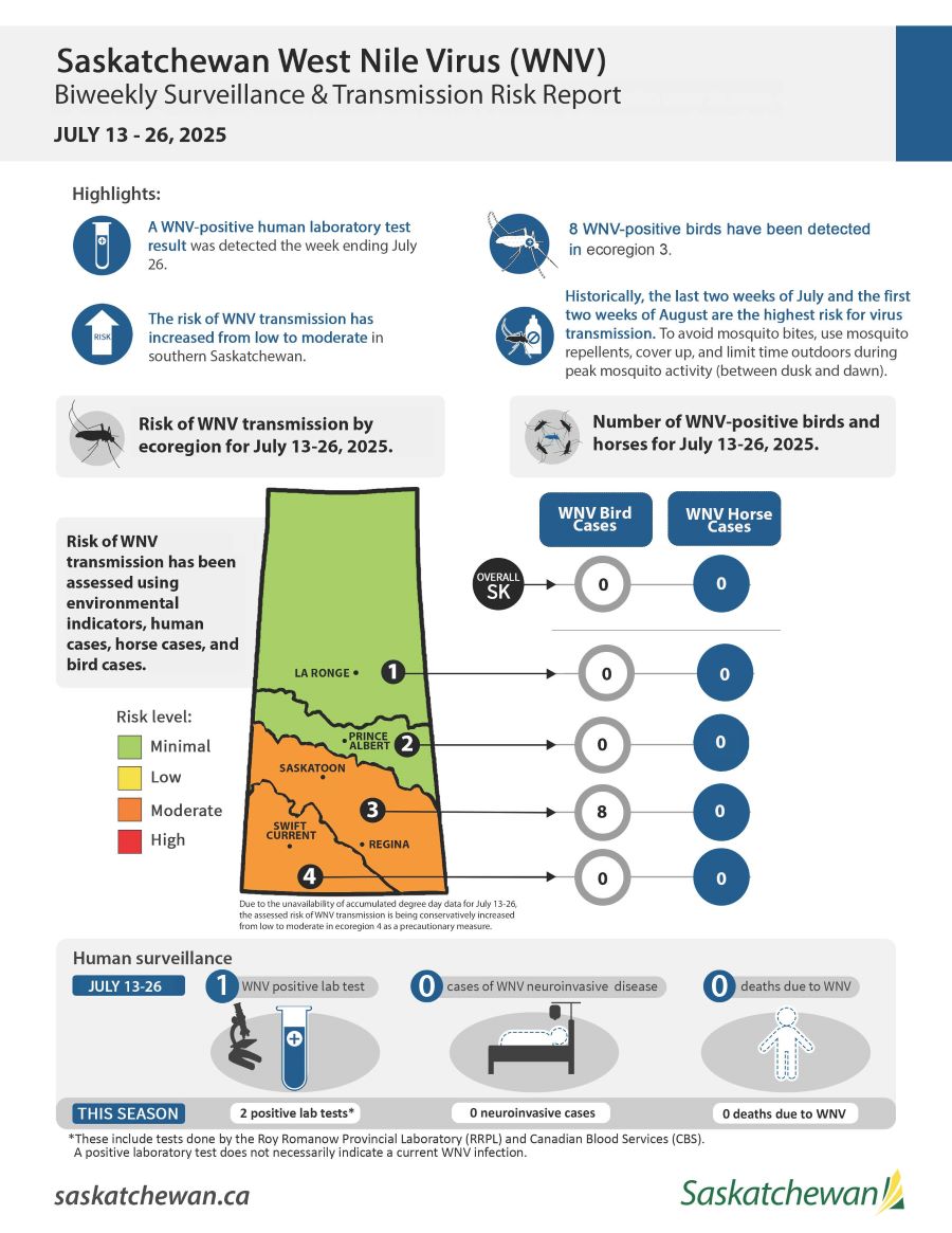 Regardless of the West Nile virus risk level in Saskatchewan, remember there is always some risk of WNV transmission except after a wide-spread hard frost and throughout winter. If you get bitten by an infected mosquito, you can contract West Nile or other mosquito-borne viruses.